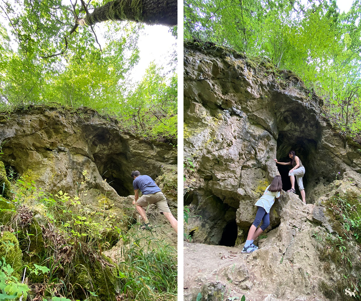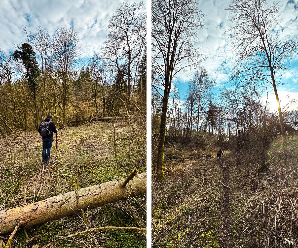 Der Pfad war leider an ein paar Stellen durch herabgefallene Äste und einen ganzen Stamm blockiert, so dass ein bisschen Bücken und Kraxeln notwendig war. Wenn Euch das zu umständlich ist, könnt ihr auch einfach den Pfad, den ihr zur Höhle genommen habt, wieder hinunter ins Tal gehen.