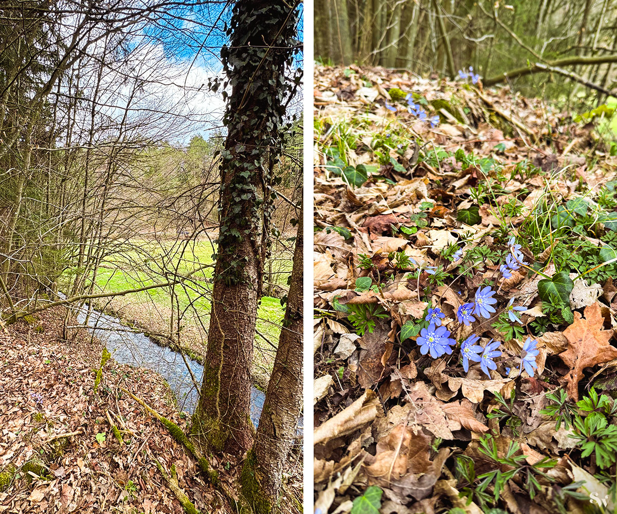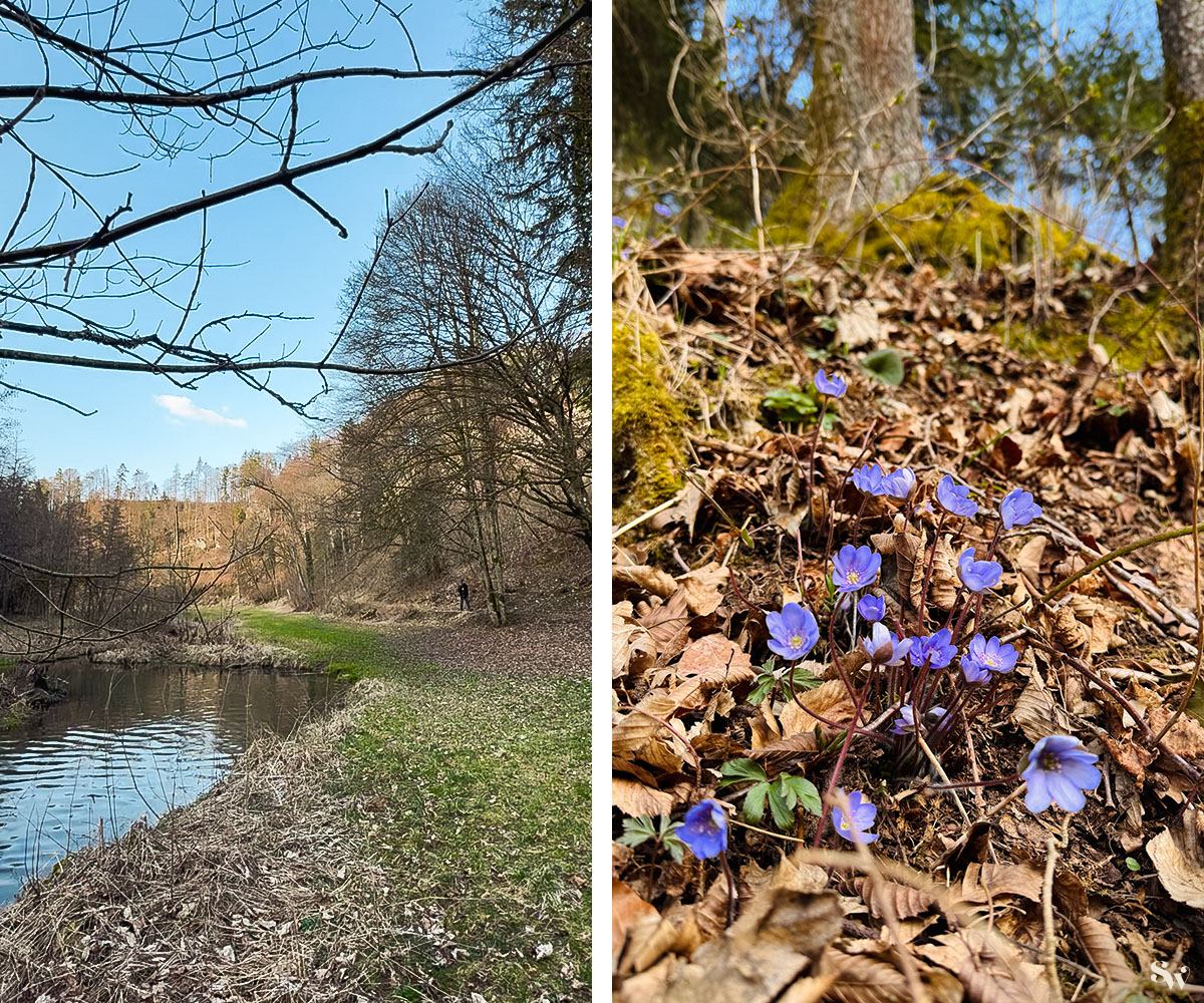 Die Aufseß ist auch hier herrlich klar und am Wegrand schimmern schon wieder Blümchen: diesmal violette Windröschen!