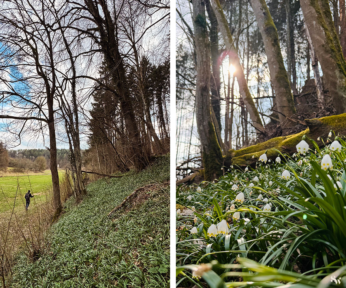 Der Waldboden ist an dieser Stelle geschmückt mit tausenden Märzenbechern, auch bekannt als Frühlings-Knotenblume.