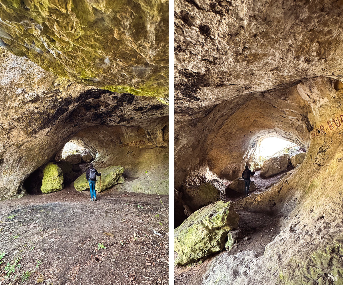 Dieser Felsen ist wie ein Schweizer Käse komplett durchlöchert und bietet dementsprechend viele kleine Höhlen und sogar eine größere Durchgangshöhle zum Erkunden. Die Bilder, die ihr hier seht, stammen von einem Besuch im Sommer. Auch für diesen Felsen gilt: zwischen Oktober und März bitte nicht betreten und die Fledermäuse in Ruhe lassen. Danke!