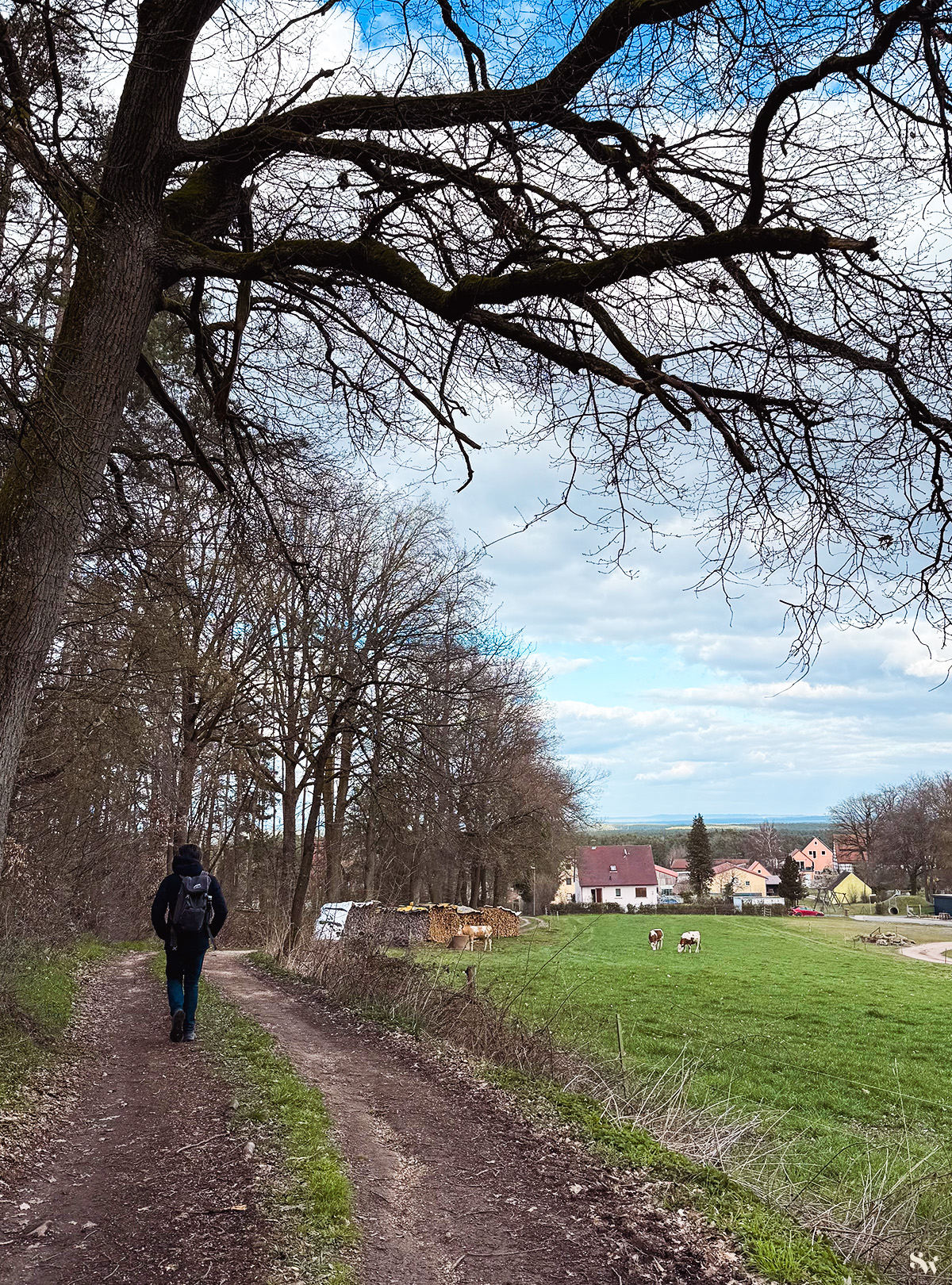 Dazu biegen wir ab in den Weg "Am Galgenberg" (Abenberger Wanderweg Nr. 5). Da hier Tiere gehalten werden (Esel, Ziegen, ...), müsst ihr ein Viehgatter öffnen.