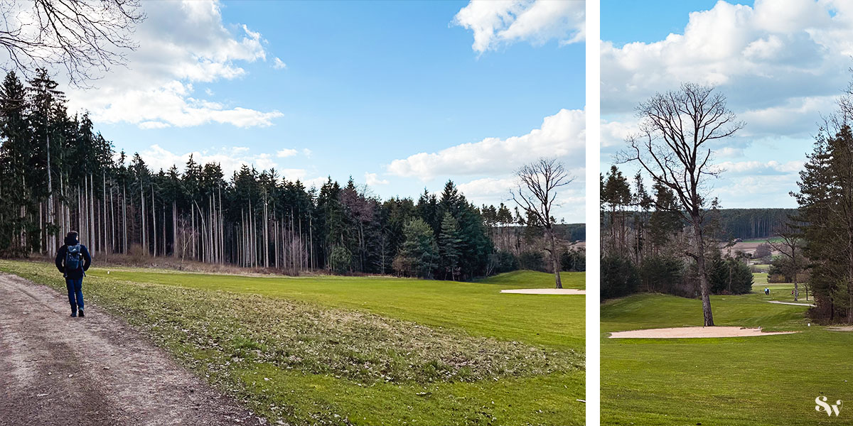 ... und machen uns, am Golfplatz vorbei, wieder auf den Rückweg nach Abenberg (Abenberger Wanderweg Nr. 6).