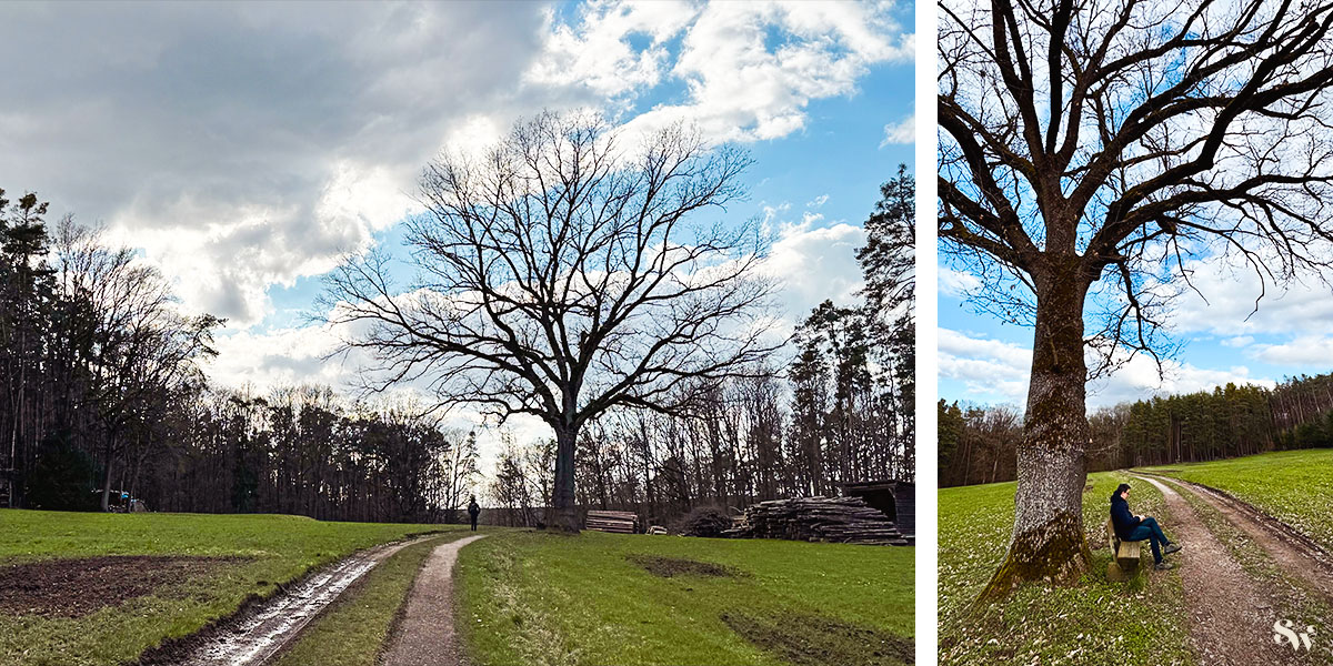 Wir laufen abwechselnd durch Wald und über Lichtungen. Zeit für eine kleine Rast unter dem alten Baum bleibt auch.