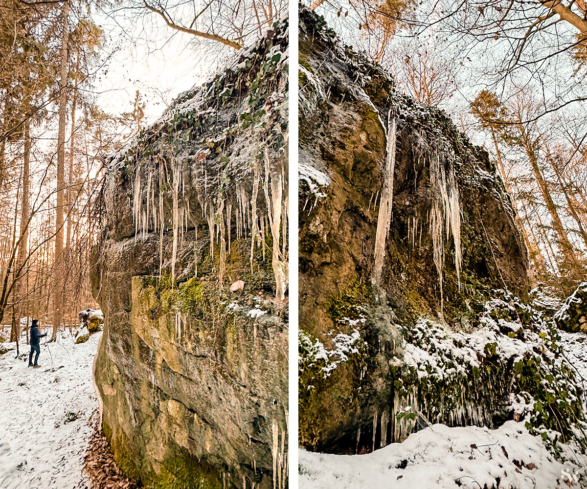 Auf dem Plecher Höhlenweg könnt ihr (fast) alle paar hundert Meter eine Höhle entdecken. Richtig reingehen könnt ihr im Winter zwar nicht (wegen der Fledermäuse) aber trotzdem lohnt sich ein Besuch der Felsen und der Höhleneingänge, besonders wenn's schön eisig ist.
