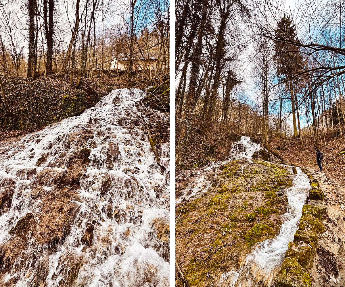 Während unseres Besuchs führte der Bach dank der Schneeschmelze richtig viel Wasser, so dass er dem Weg am Rand bedrohlich nahe kam.
