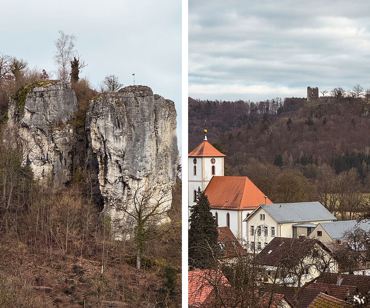 Hier gibt es gleich zu Beginn einen schönen Ausblick auf Streitberg, die Streitburg und die Neideck.