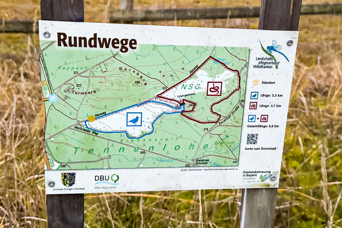 Für unsere Tour entschieden wir uns, rechts um das Gatter zu laufen. Hier gibt es einen durchgängigen Pfad und immer wieder Übersichtspläne und Infotafeln zu Flora und Fauna.